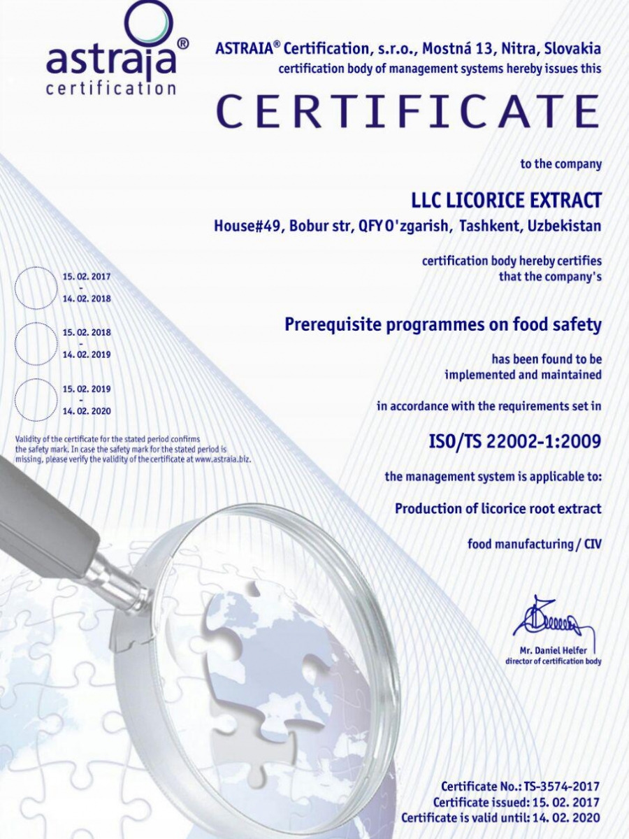 Also, you can check the validity of our certificates ISO 22000: 2005 and FSMS ISO / TS 22002-1: 2009 on the website: http://www.astraia.sk/index.php?page=certificate-search-en